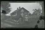Rumsinteriör, en äldre man och två småbarn. Gammelfarfar Anders Edvard Lindin med barnbarnen Erik och Maja Lindin. Bilden tagen 1918 eller 1919.