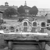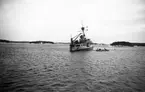 Bilden visar en ångbarkass som passerar flygplanskryssaren framför kulissen av Södermalm.