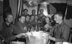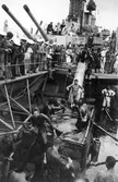 Besättningen på flygplanskryssaren Gotland titta på när ett sjöflygplan skjuts iväg med katapult.