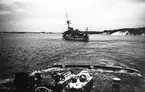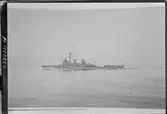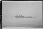 På vänster bildkanten syns en torpedo som skjuts iväg från flygplanskryssaren Gotland.
