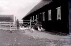 Lantgård nära Lindome vid vägen till Spårhaga. Vid portlidret står dasset på höger sida och till vänster kan ladugårdens djur gå ut i en fålla. Elledningar angör ladufasaden till höger sida och där ses bostadshusets gavel. Framför ladugården går en flock gäss.