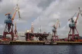 Dockning vid Götaverken. M/S Cleopatra går in i stora dockan, som har en lyftkraft av 18000 ton. DEn mindre dockan lyfter 8000 ton.