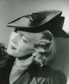 Kvinnlig modell i svart balibuntalhatt med garnering av svart grosgrainband. Nordiska Kompaniet, Stockholm.