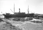 Medföljande text: "S/S Bra-Kar från Kristiania, 8 500 ton. Lastning av gatsten vid Idefjorden, omkr. 1912. Repro efter Granitindustriboken, (Thor Andersson)". Text på kortet: S/S "Bra-Kar" from Kristiania 8500 tons d.w. loading full cargo from firm ice-edge at Idefjorden for Buenos Aires 23rd February 1912".