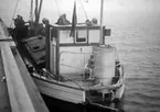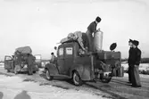 Nuvarande skeppsbrokiosken. Grosshandlare K G Johansson vid personbilen 1940-41. Obs! gengasaggregat på lastbilarna.