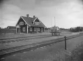 Häggenås station med vedlok Station anlagd 1910. En- och enhalvvånings stationshus i trä. Expeditionslokalerna modrniserades 1947. Växelförregling med kontrollås, men växlarna äro icke centralt omläggbara