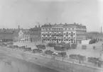 En kusk, två kvinnor och en flicka sitter i en droska utanför ladan vid Stretereds skolhem cirka 1920. Bildtext från album: "Gunnar och bägge Hilda-töserna på Stretered." En av Hilda-töserna är Hilda Olsson (1887-1973, 1923 gift Sandberg). Hon arbetade som husa hos Håkan Jönsson som var rektor på Stretereds skolhem. Flickan heter Irene.
