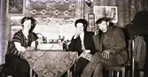 "Kloar-Erik "lyssnar på en ålderdomlig radio, s k kristallmottagare, med hörlurar tillsammans med två kvinnor i Kloskift. De sitter vid ett bord där apparaten upptar större delen av ytan.