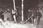 Storgatan 16, Thulinstomten. Under rivning 1912. I 1:a fönstret från vänster: okänd, i 2:a fönstret: snickarna Molin, Frejagatan 7,Amadeus Johansson, Daretorp, och Auf. Hjellström, Bestorp, i 3:e fönstret: kakelugnsmakarna Carl Högberg och Johan Nilsson, i 4:e fönstret: 2 skolpojkar, av dem t.h. förmodligen son till brevbärare Ullberg, i 5:e fönstret: snickare Valfrid Andersson, Stommen, Luttra, och handl. Nils Johansson i firma Johansson & Plith, med affären i huset, som skymtar t.h. på kortet och som var den förstbyggda delen av hela komplexet Storgatan 16, och vilken första del uppfördes där de gamla s.k. "Basar-bodarna" stått. På hästskjutsarna fr. v.stadsarbetare Natanael Karlsson (kallad Pipe-Karlsson på grund av att pipan ständigt hängde i munnen) och Levin Johansson, Blåsås.På gatan (bakre raden) fr. v. snick. Johannes Olsson (kallad Ost - Olsson, emedan han var gift med osthandlerskan Anna Olsson), springpojken hos Lindgrens Joh. Oskar Barkh, fyra okända , och sist t.h. handelsbiträde