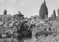 Familjebild i Mathilda Ranchs trädgård med handelsmannen Oscar Pehrson och hans barn Greta, Håkan och i knät Sven. Deras hund ligger vid Håkans fötter.