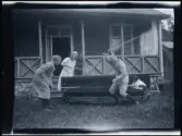 Två unga kvinnor krattar i trädgården till Villa Solveden, Djursholm.