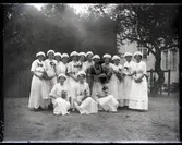 "Husmodersskolan". Kvinnor i vita husmorsdräkter.