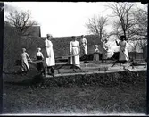 "Husmodersskolan". Åtta kvinnor arbetar i köksträdgården utanför Husmodersskolan.