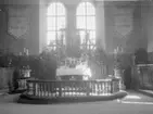 Interiörfoto från (trol. kapellet på Tegnérkyrkogården) inför en begravning. Man ser en mörk kista omgiven av höga kandelabrar och blommor.