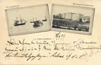 Tre skeppsgossar låter sig poträttfotografera i sovsalen. På höger sida syns våningssängar.