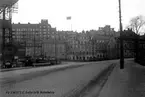Foto i svartvitt visande hamnbild från Stockholm med passagerarfartygen Gripsholm, Caronia och Bergensfjord på Stockholms ström den 22 juli 1958.