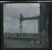 Utsikt över Slussens trafikanläggning med Kolingsborg mot Gamla Stan och Riddarholmen. Slussen sedd i skymning, kvällsbelysning.
