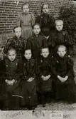 Enligt text som medföljde bilden: "Fru Bogren, Konsul Radhe, Professor Murray, Kamrer Hallgren, Dr. Landelius, Professor Wide, Fröken Lotta Husberg, Fröken Emma Hasslöf, Fröken Hansson och Fröken Anna Olsson." Enligt text som ristats i emulsionen: "... och Betjäningen vid Lysekils badanstalt sommaren 1901."
