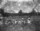 Ett sällskap, ute på en åker som hässjar hö.