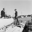 Manskapet och befäl på fartyget Gotland har tagit uppställning på däck för att hälsar kungen välkommen som håller på att embarkerar.