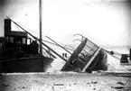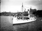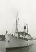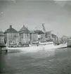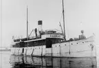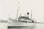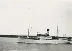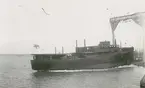Foto i svartivtt visande passagerarångfartyg [här omändrat till lastfartyg] ELLIDA av Stockholm i Köpenhamn.