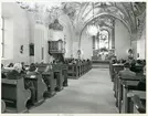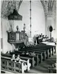Kung Karl sn, Kungsör. Interiör av Kung Karls kyrka, med Kyrkbänkar, orgelläktare, psalmtavlor m.m.