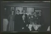 "Kyrkvaktare Pettersson med barn Gryt." Porträtt av en man som sitter vid ett bord med gratulations-blommor. Hans familj står omkring.