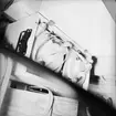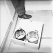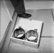 Tvättare, 28 maj 1966 En man klädd i vit skjorta och svarta byxor samt stövlar lyfter upp ett klädesplagg ur en låda. Han står invid en stor tvättmaskin. I bakgrunden står en kvinna klädd i vit arbetsrock intill en man även han klädd i vitt. Klädesplagg hänger på galgar i bakgrunden.