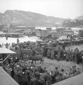 Livdjursauktion i de av staden byggda kreatursstallarna. Julius Månsson var i många år "ropare" vid auktionerna och fick en silver klubba i belöning av Hushållningssällskapet. Text A.S.