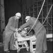 Studiebesök vid SKF i Katrineholm 1961 Besöket gjordes i samband med fältövningen 17--22 april. Bild 1: Mannen till v. om regementschefen är Katrineholms första, och sista, borgmästare Hilding Hjelmberg. Mellan Hjelmberg och Virgin fanjunkare Sven-Börje Lundgren och till h. om Lundgren furir Stig Gustavsson. Bild 2: Samma motiv, men ur en annan vinkel. I fältuniform överstelöjtnant Gerhard Hjukström.