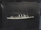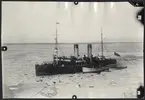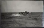 Bilden visar en slup som närmar sig en S 17 sjöflygplan som har landat på vattnet.