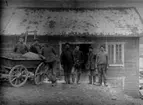 Hultakvarn i Grimmared. Mannen till höger är Karl Kärrbrant (född Johansson) från Istorp. Vid kvarnens ingång står en man med en stor säck på hästdragen kärra. På säcken ligger en hund. (Negativet är skadat)