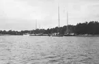Båtar förtöjda vid Museikajen i Stockholm. I bakgrunden Skeppsholmen, Strandvägen och Djurgården med Nordiska museet. Motorjakten med ljust skrov till v (skymd) är den C. G. Pettersson-ritade TATJANA (1921), i bakgrunden till h skymtar postångaren ÖLAND (b. 1883, reg nr 3889).