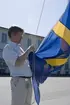Museichef Klas Helmerson vid rodret på kommandobryggan. I förgrunden maskintelegrafen.