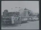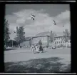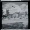 Tyresö slott från entrésidan. Gårdsplanen är krattad och framför byggnaderna vajar svenska och amerikanska flaggor.
