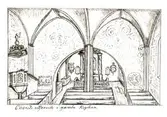 " Teckning av N J Löfgren 1820. I Löfgrens "Calmar stift" I. ATA. Ålems gamla kyrka, östra delen samt koret. Teckning av N J Löfgren 1820. Efter Löfgrenska samlingen i ATA; Kungliga Vitterhets- Historie- och Antikvitetsakademien. Här synes den breda triumfbågen mellan långhuset och koret, vidare skeppets pelare och valv. Alldeles till höger om bågen synes det målade fältet med Johan Skyttes och hans makas vapen samt inskription, angående donationen av kyrkans målningar. På motsvarande plats vänster om bågen hänger den ännu bevarade oljemålningen med Lazari uppväckande. Vid båda sidorna om altaret nummertavlor samt två adliga banér, det Ribbingska och det Mörnerska." Ålems kyrka.