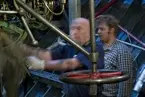 Museichef Klas Helmerson vid rodret på kommandobryggan. I förgrunden maskintelegrafen.