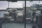 Besättningsmän sitter på lastlucka på M/S NORDSTJERNAN.