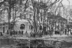 Enligt senare noteringar: "Borrarlaget vid älven enl. fotografens liggare. Det är tydligen förstärkning av älvbanken vid Sohlbergs. I bakgrunden skymtar taket på brukets pappersmagasin." (BJ) Fotot är taget 1920-03-19.