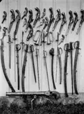 Hittegodset 31 mars 1966 Föremål på Polisens Hittegodsavdelning står uppställda på ett bord: ett paket hundmat, ett par svarta damskor, en radio, en navkapsel från en bil samt en pistol. or. Han går nedför en kort trappa utomhus.