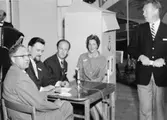 "Vem vet mest - posten eller pressen ?". Tävlingen leddes av norrmannen Rolf Kirkvaag. Postlaget vann och här ses fr.v. Stig Gardtman, Per-Olov Viklund, Bertil Wademan och Margareta Hallengren.
