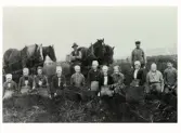 "Skördearbete. Potatisplockning hos kommunalordförande Algot Bengtsson i Träslöv 5.10.1924." Stående: Algot Bengtsson och Aron. Sittande fr.v: Rut, Elsa, Selma, Junis, Ester, Hulda, Ester, Elin, Elsa, Astrid och Gunnar. Två par hästar står bakom folket.