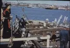 Ett publikhav tittar på fem militära fartyg som skjuter under en uppvisning i Skälderviken. Bilden är tagen i samband med "Operation kullen" 1955.