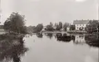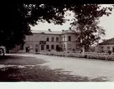 Två unga kvinnor i kappa och hatt utanför stora entrén till landshövdingens residens i Växjö. Suddigt foto.