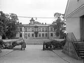 Tre tonårsflickor utanför stora entrén till landshövdingens residens i Växjö.
