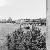 Utsikt från Västerbron över den isbelagda Riddarfjärden mot Norr Mälarstrand. I fonden t.h. Riddarholmen. Vandrare på Riddarfjärdens is.