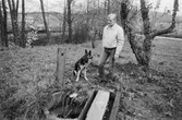 "Bengt Olsson med sin schäfer Olsson vid den 10 m djupa och vattenfyllda brunnen." Våmmedal i Kållered, år 1984. För mer information om bilden se under tilläggsinformation.