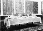 "Bygge och Bo" utställning på Liljevalchs konsthall 1928. Uppdukatbord med brutna servetter. Mattupphängningar på väggarna.