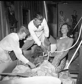 Simbassängen på Sparre Simhall, interiört. I bakgrunden syns en muralmålning ovanför en rad skåp föreställande en sjöjungfru omgiven av fisk och koraller. Konstnär: Erik Ahl????
