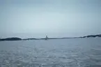 Vy över stuga på Simpnäs tillhörande Volrat Ulfwi. Bilden tagen från folkbåten KARP.
